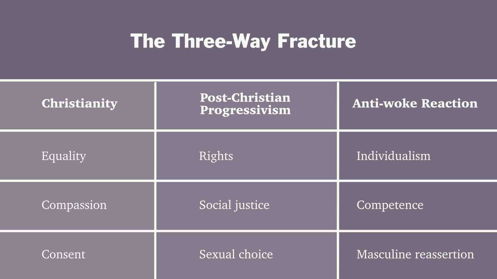 Постхристианские прогрессивные ценности (средний столбец) вытекают из христианских принципов и были бы немыслимы без них, но произошел решительный сдвиг.