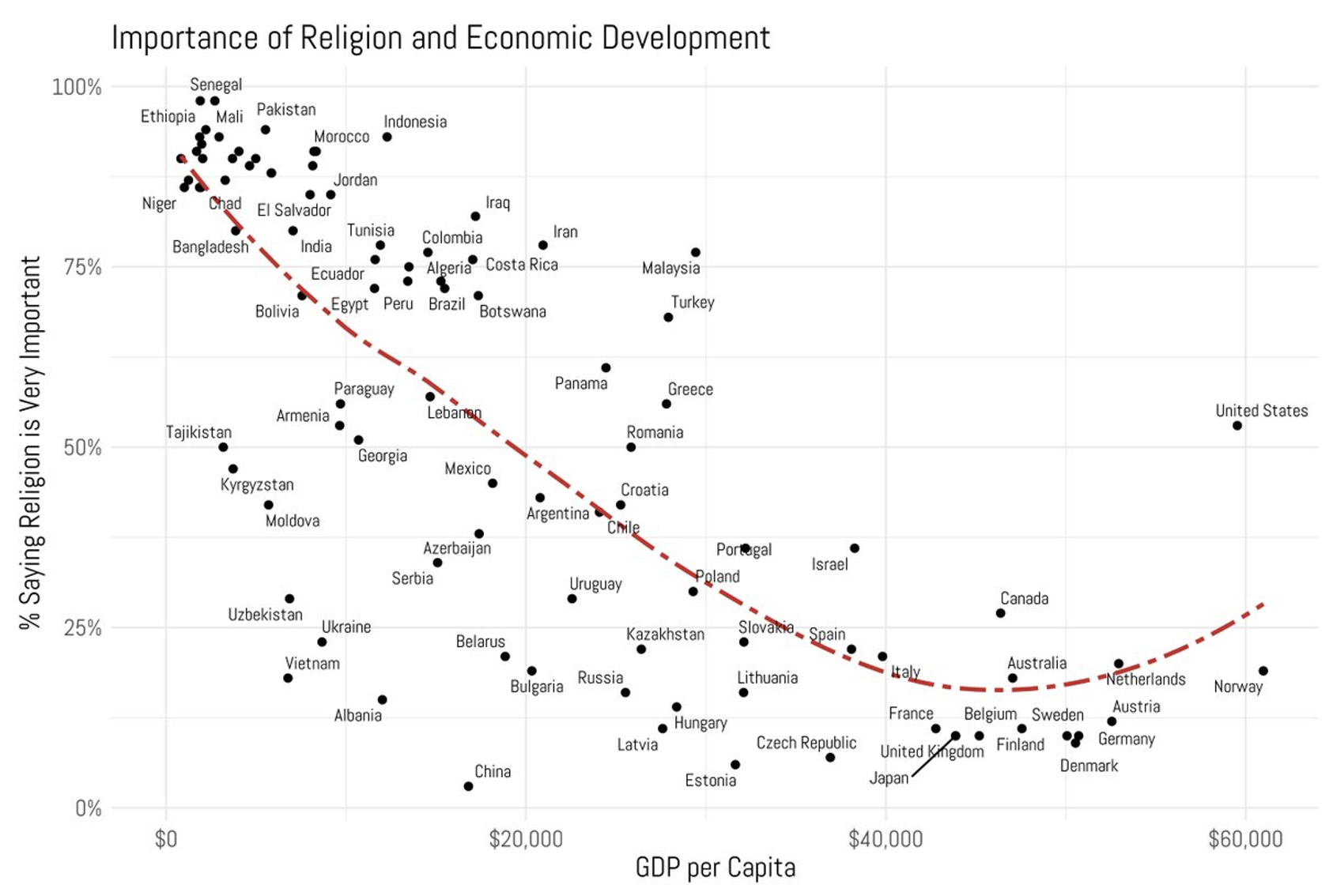 Это стандартный тезис секуляризации. Зарабатывайте деньги, теряйте Бога. Норвегия является самой богатой страной в мире, согласно ВВП на душу населения. Она опережает США. Менее 20 процентов норвежцев говорят, что религия очень важна. В Дании, Швеции и Финляндии этот показатель еще ниже.