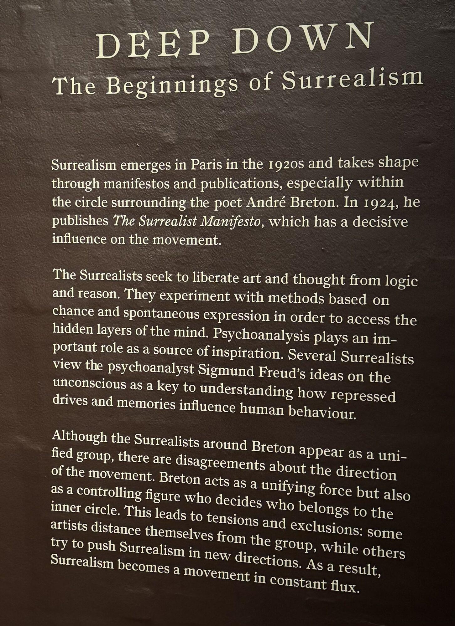 Я не считаю себя экспертом в сюрреализме, поэтому я прочитал объяснения куратора об Андре Бретоне и его Втором манифесте сюрреалистов 1929 года. Вот одно из этих резюме: